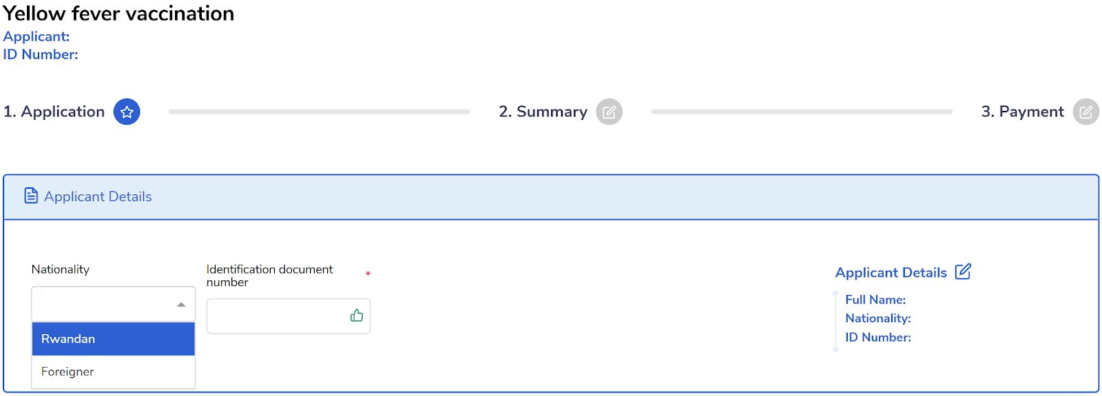 For an Applicant application, enter your identification number (National ID for Rwandans and Passport number for Foreigners), and the details will be displayed on the right side of the page.