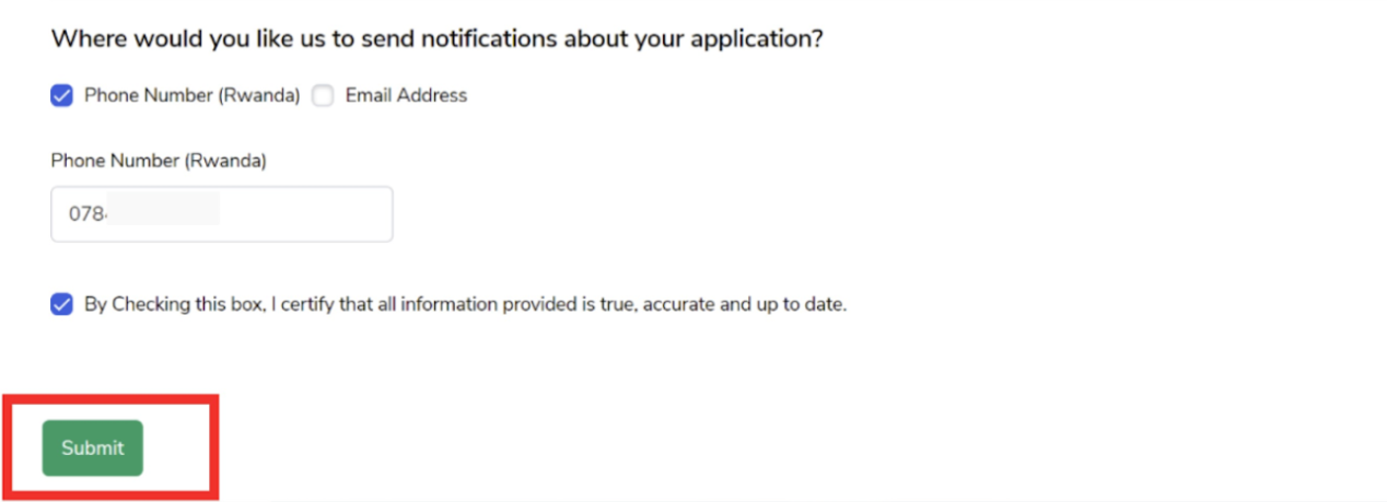 Verify the information is accurate, enter a phone number and/or email address, check the verification box, and click Submit.