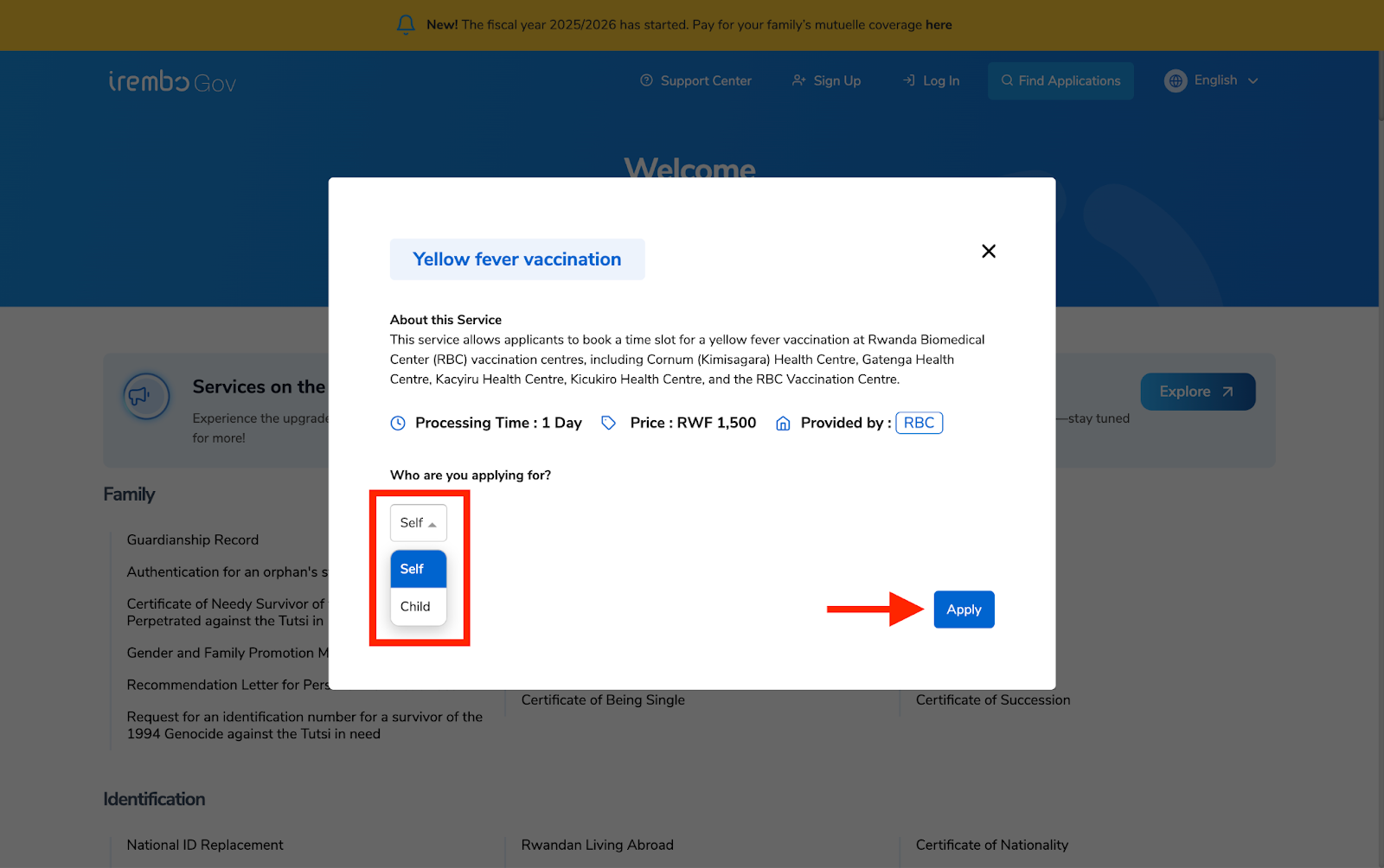 This article guides the agent in applying for and paying for a Yellow Fever Vaccination on the user's behalf. This service enables applicants (Rwandans and foreigners) to book a time slot at the Rwanda Biomedical Center in Gikondo to get a yellow fever vaccination. The service is provided by the Rwanda Biomedical Center (RBC).