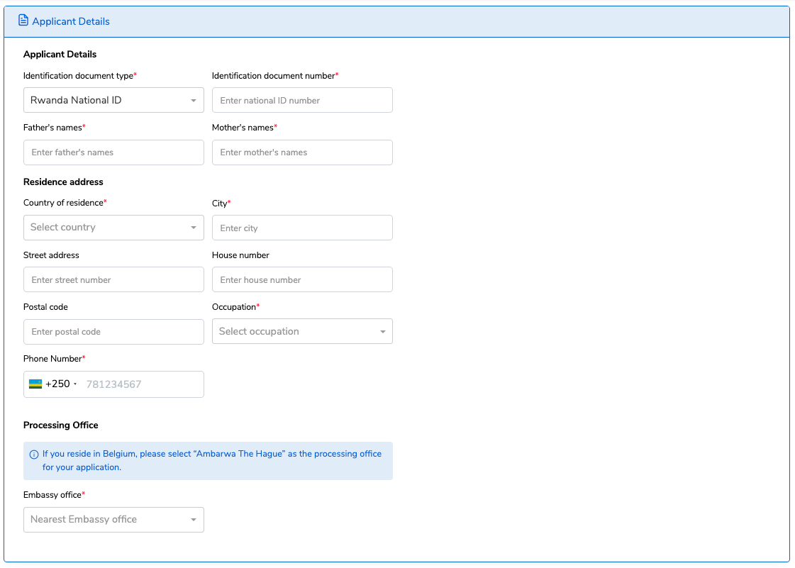 Step 5: Fill in the applicant’s information, “ applicant details”, and residence address, and then select the embassy office based o their country of residence.