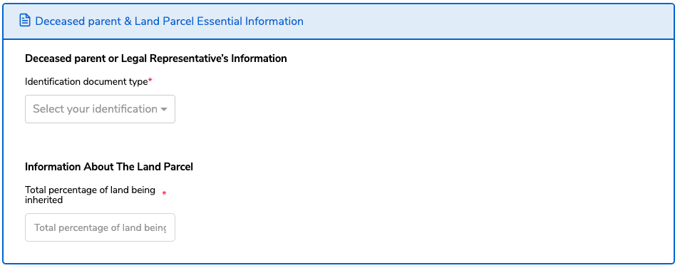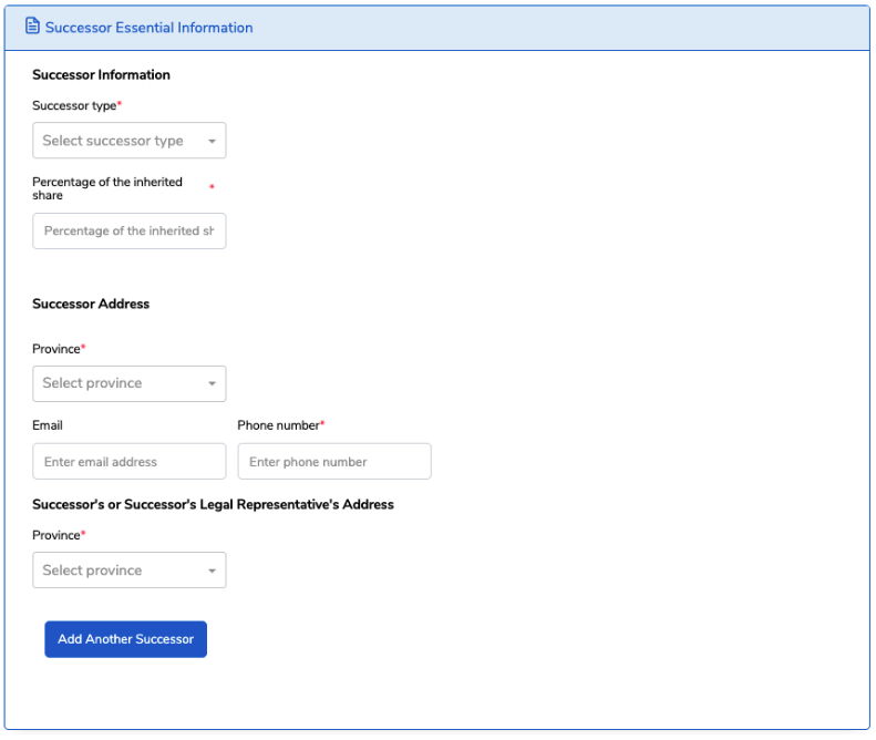 Add details for the parcel, such as the Parcel UPI and its location. Include successor information, which may consist of the Successor Identification document number and their residence address.
