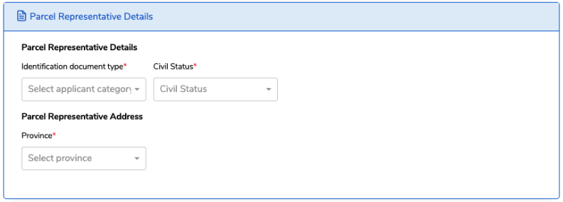 Add the Parcel’s Representative details including their Identification document type, civil status, his address.