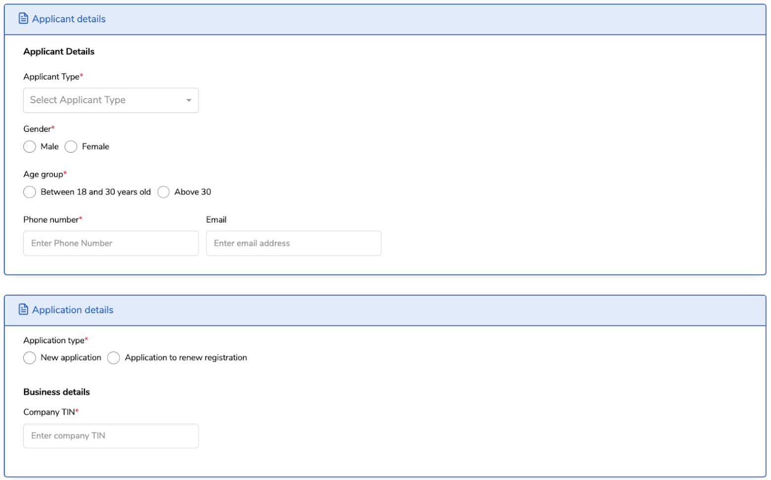 Fill in the applicant's details (select if the applicant is the business owner or legal representative, add the age group and other required personal information).