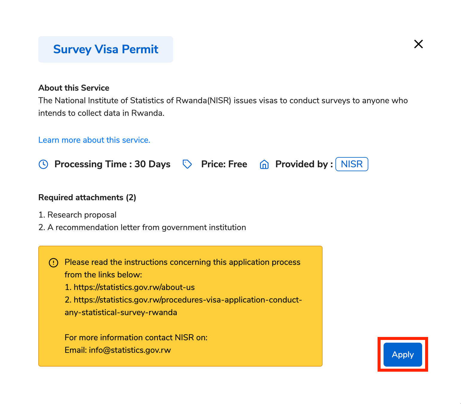 The National Institute of Statistics of Rwanda(NISR) issues visas to conduct surveys to anyone who intends to collect data in Rwanda. This article acts as a guide for Agents applying for the service on a user’s behalf.