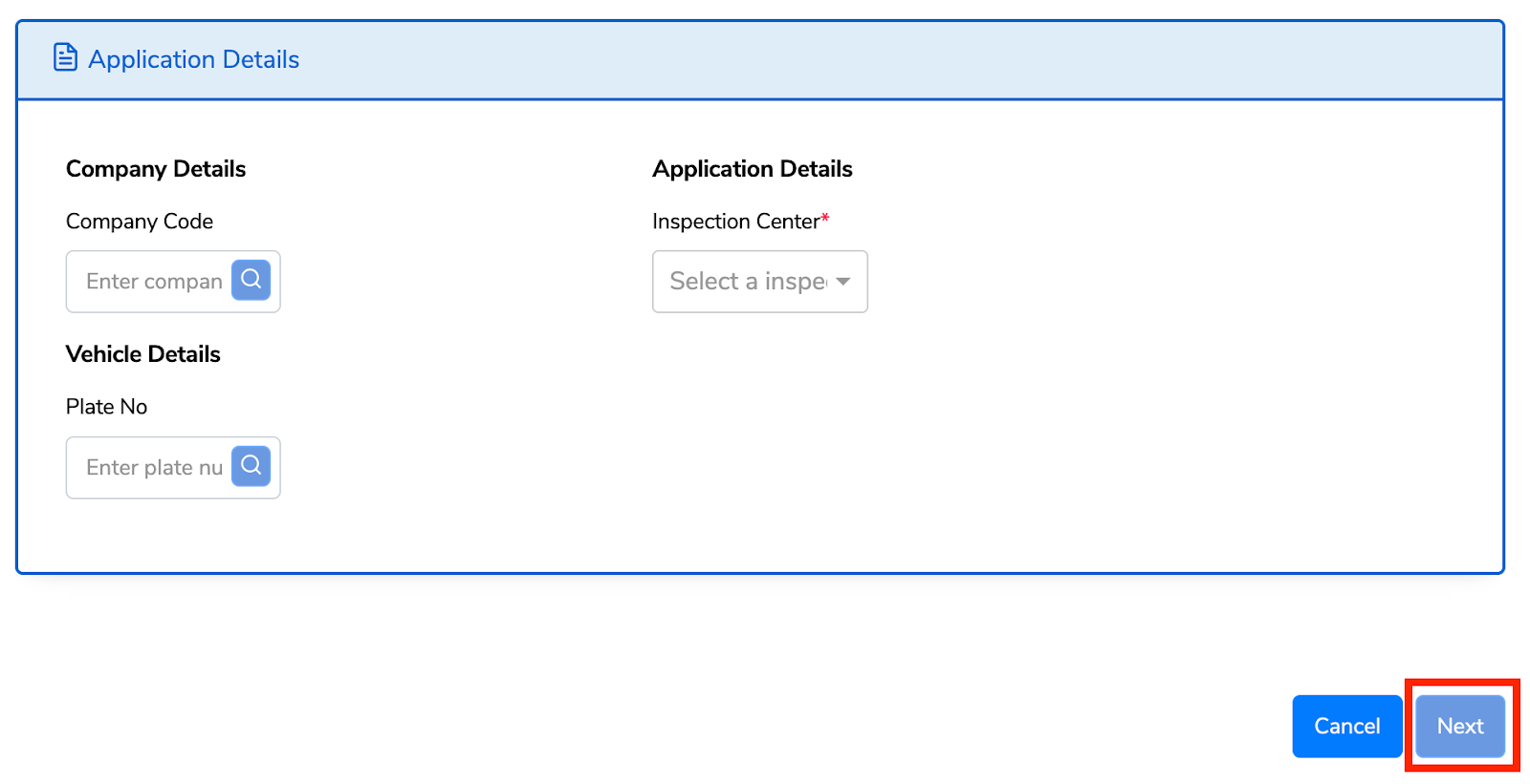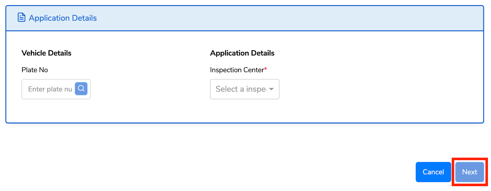 Enter the vehicle details, including the plate number and Inspection center. Then click Next.