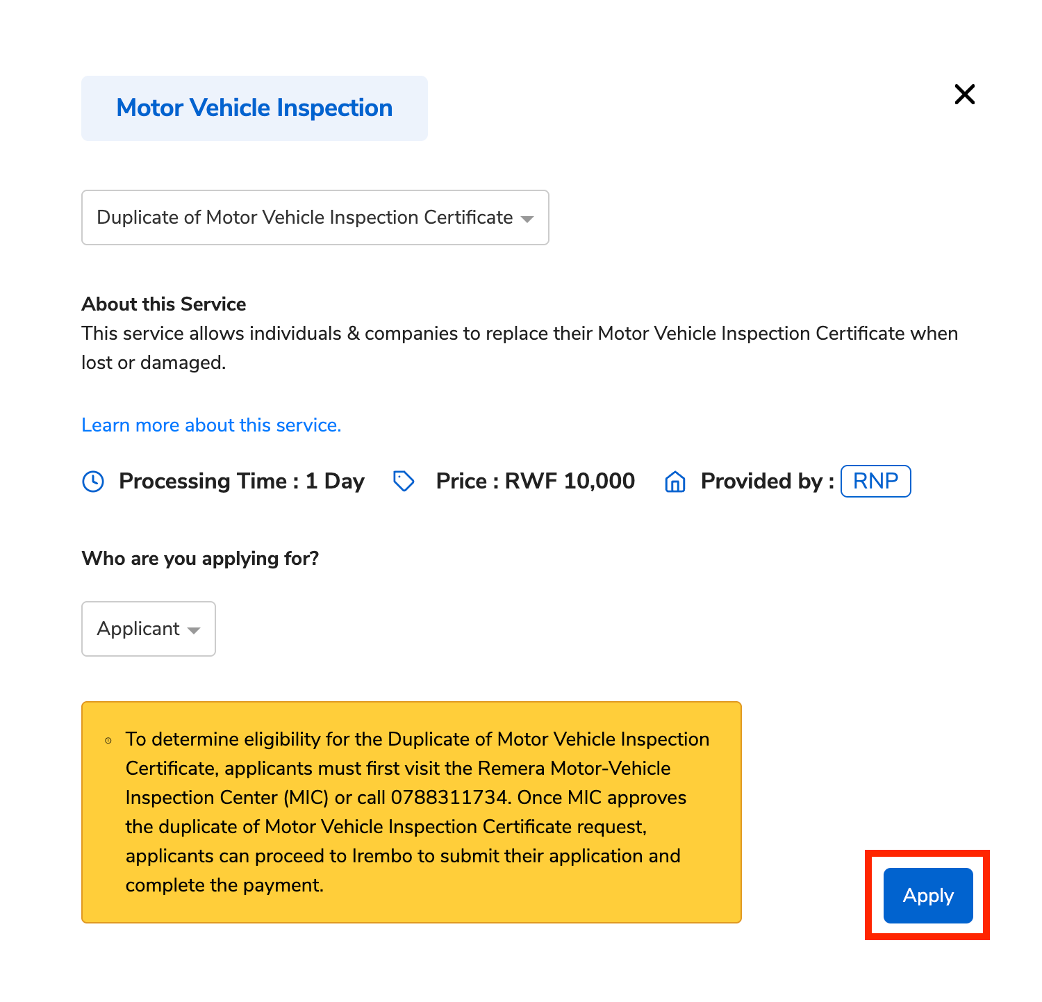 To determine eligibility for the Duplicate of Motor Vehicle Inspection Certificate, applicants must first visit the Remera Motor-Vehicle Inspection Center (MIC) or call 0788311734. Once MIC approves the duplicate of the Motor Vehicle Inspection Certificate request, applicants can proceed to Irembo to submit their application and complete the payment.