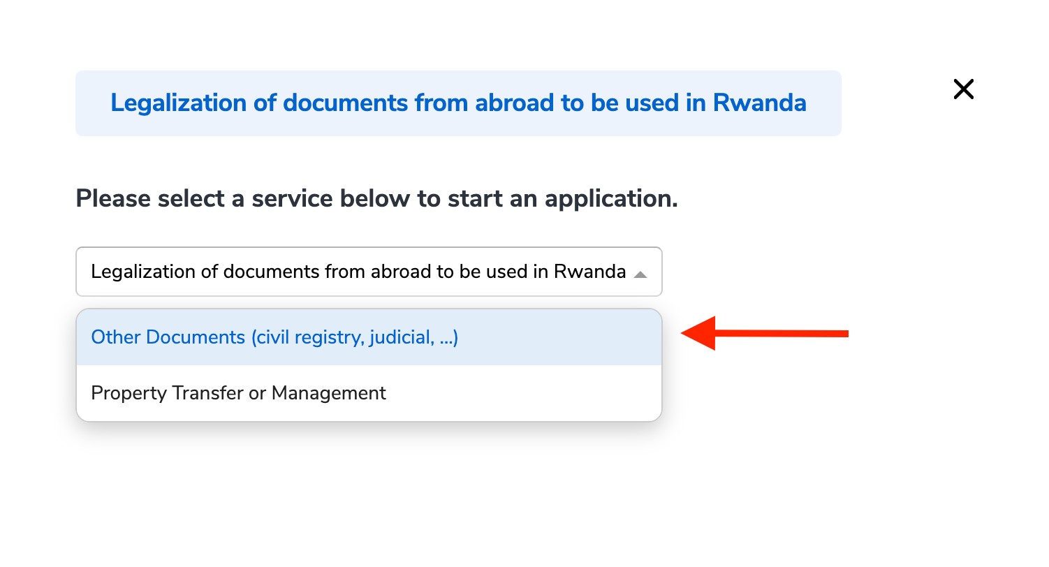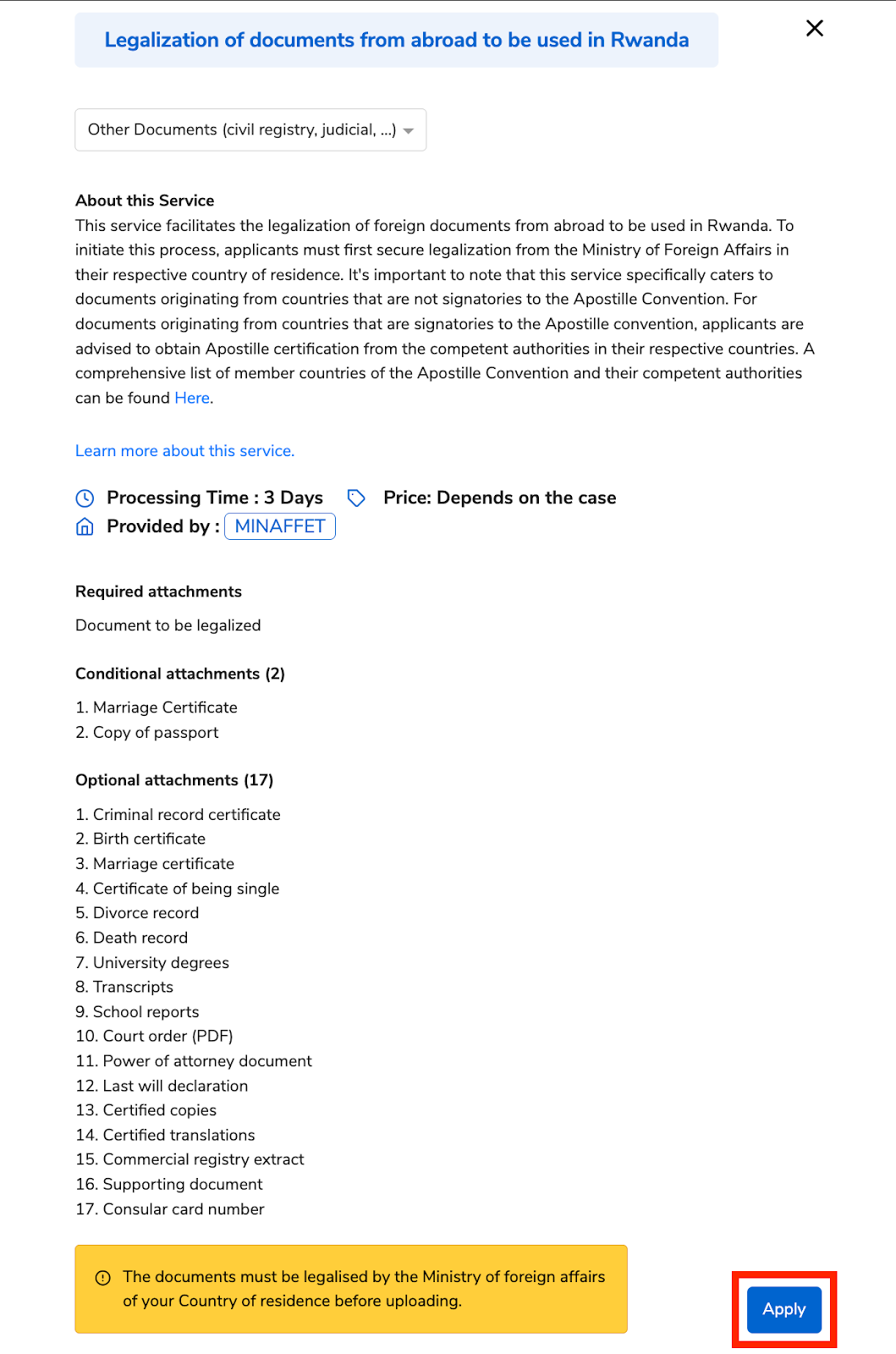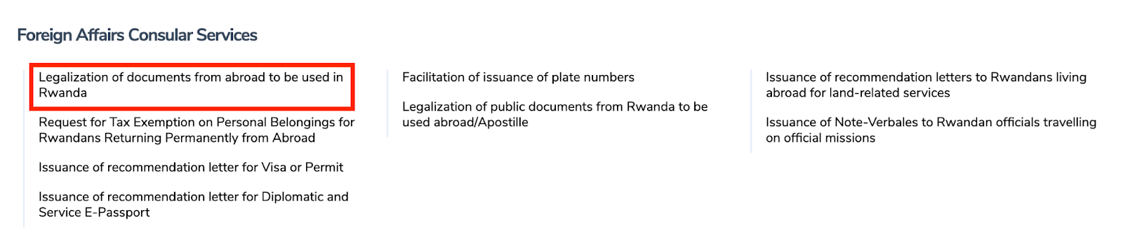 Under the category “Foreign Affairs and Consular Services”. Click “Legalisation of documents from abroad to be used in Rwanda”.