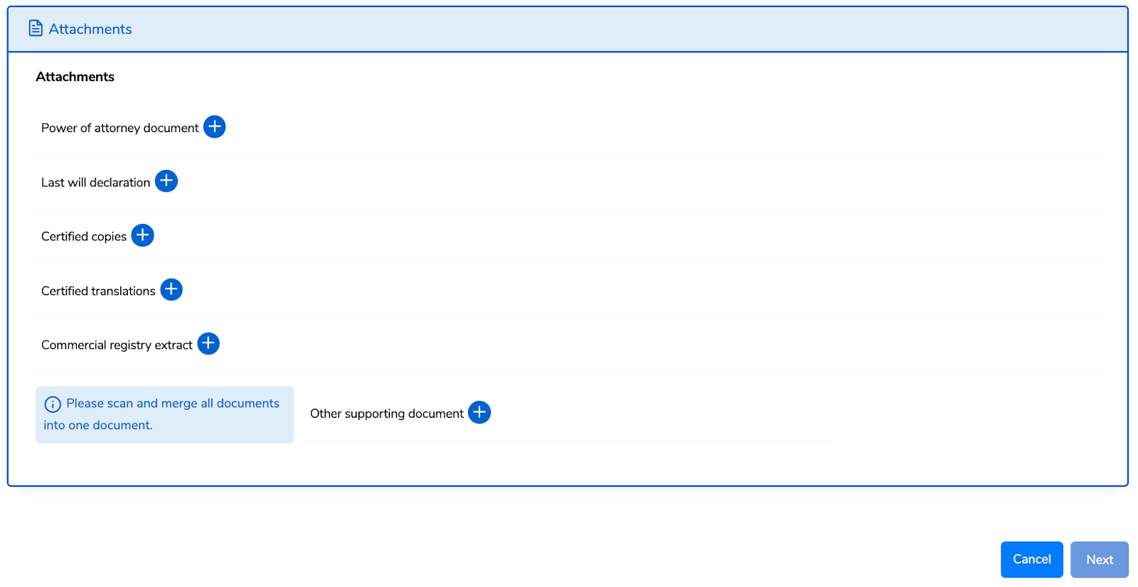 The documents must be legalised by the Ministry of Foreign Affairs of your Country of residence before uploading.