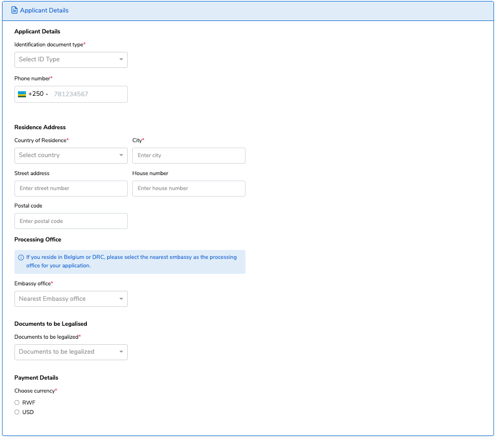 Fill in the User’s information, “Applicant Details” and “Residence details,” then select the type of documents to be legalised, the Embassy office, and finally, select the currency.