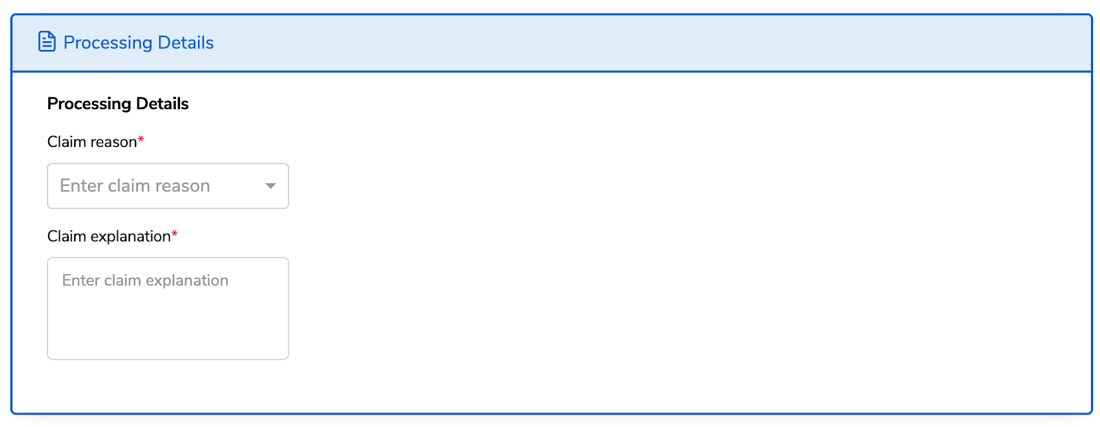Fill in the processing details including the claim reason and explanation.