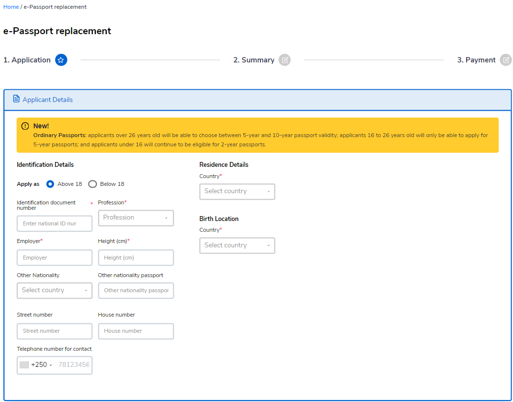 This article guides the agent in applying for and paying for an E-passport Relacement on the user's behalf. This service allows Rwandans (adults and minors) to replace their passports only in case of loss, theft, or damage. Applicants should apply for the certificate of loss via Rwanda Investigation Bureau (RIB) offices and then apply for this service. The Directorate General of Immigration and Emigration (DGIE) issues three types of passports: ordinary, service, and diplomatic.