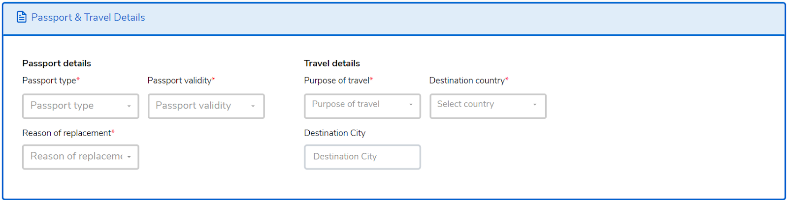 Fill in the Passport & Travel Details (including the Reason for Replacement) for the applicant.