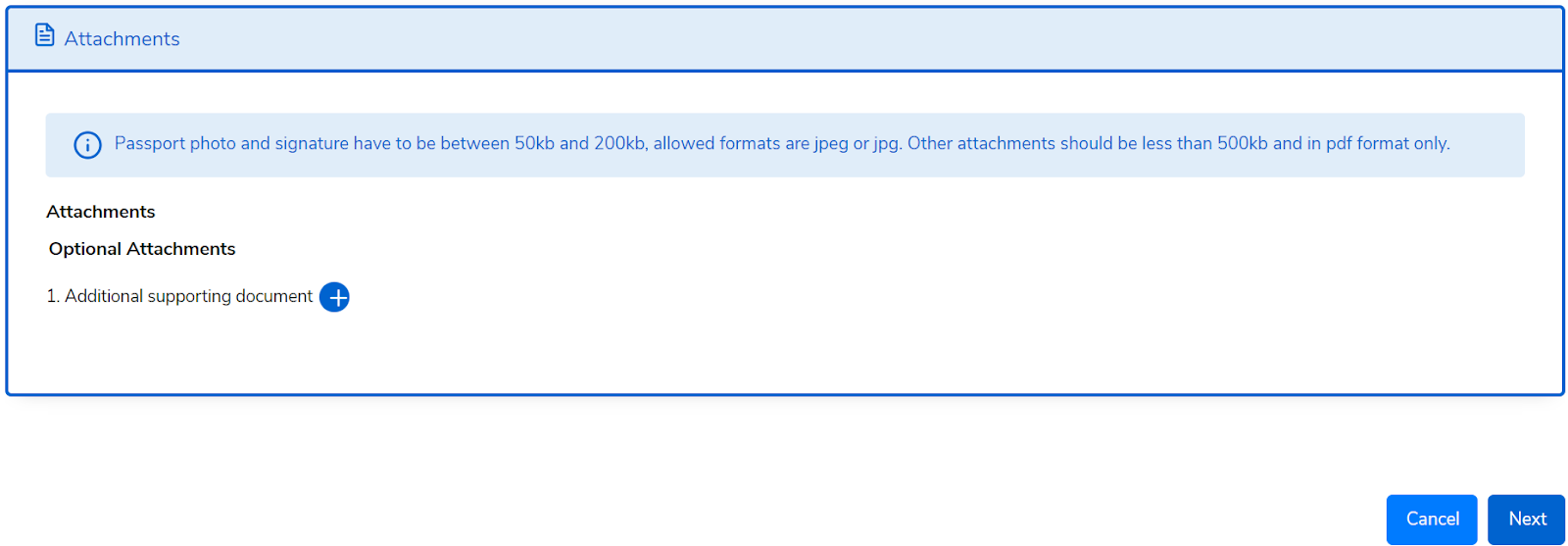 Attachments differ depending on the type of passport selected and the “minor category” for applicants below 18 years.