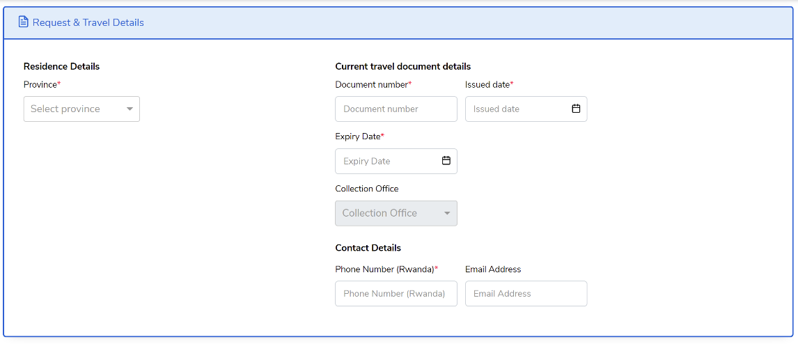 Enter the Request and Travel Details. The Collection Office is automatically set depending on the applicant’s residence details.