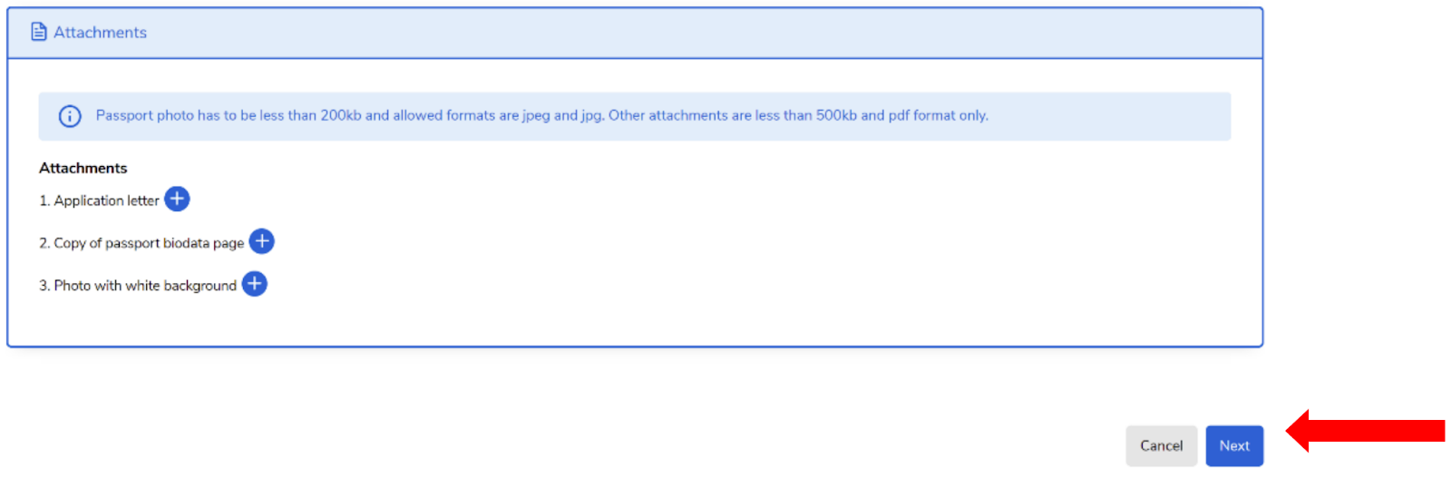 Attachments differ depending on the “Visa Type.” Common attachments are an Application letter, a Copy of the passport biodata page, and a Photo with a white background.