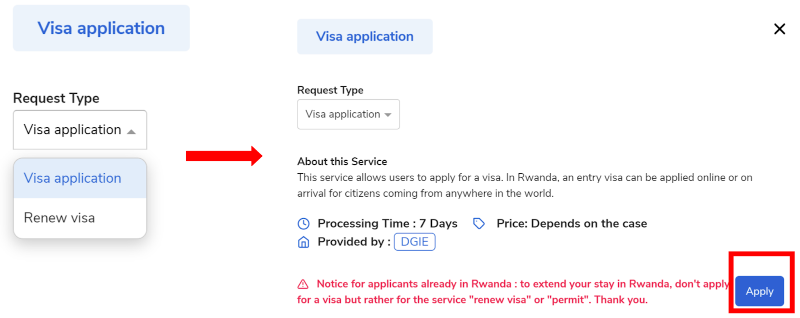 Note: For applicants who are already in Rwanda and want to extend their stay in Rwanda, please don’t apply for a visa, but rather apply for the “Renew Visa” service.