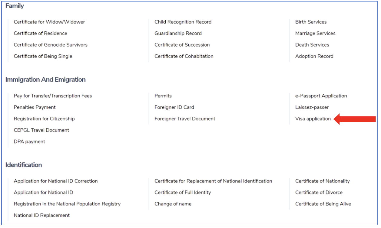 This service allows one to apply for a visa online. In Rwanda, an entry visa can be applied for online or upon arrival for people coming from anywhere in the world. A visa upon arrival can be applied for at the Kigali International Airport and all land borders. This service is provided by the Directorate General of Immigration and Emigration (DGIE).