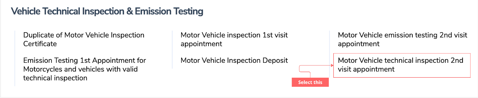 Step 2: Search for Motor Vehicle Technical Testing Second Visit Appointment under the Vehicle Technical Inspection & Emission Testing category