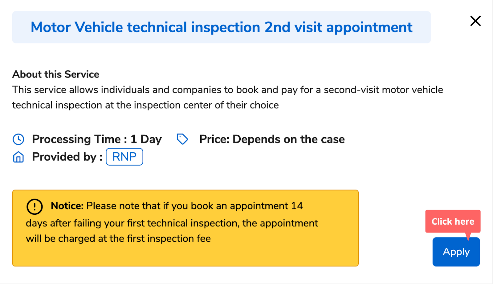 This service allows vehicle owners to book and pay for a second technical inspection visit after failing the technical inspection during the first visit.