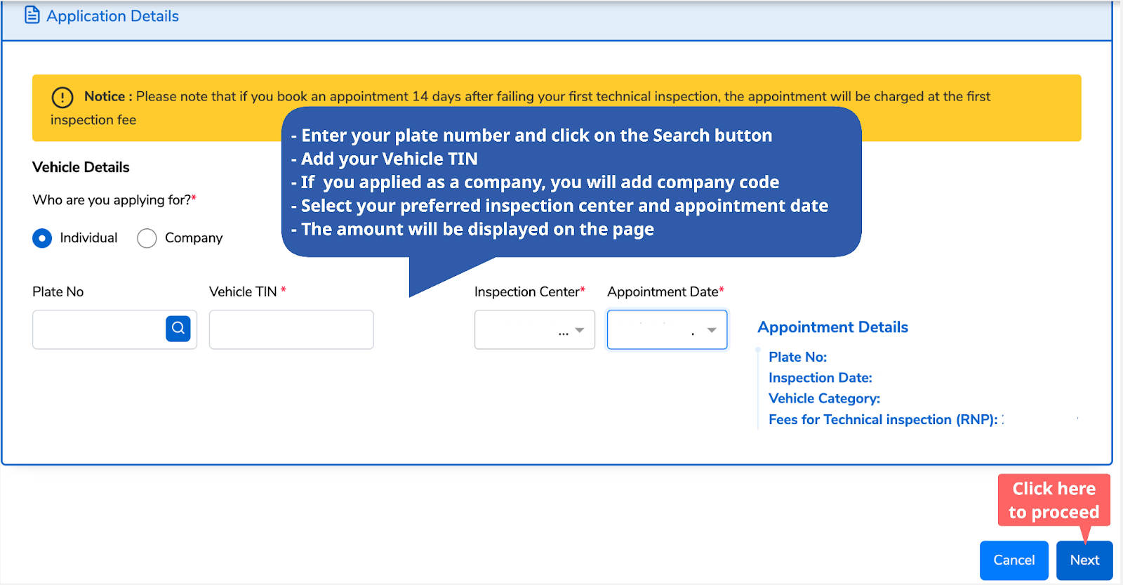 Step 3: Select who you are applying on behalf of, whether an individual or a company, and enter the vehicle details. Then click next