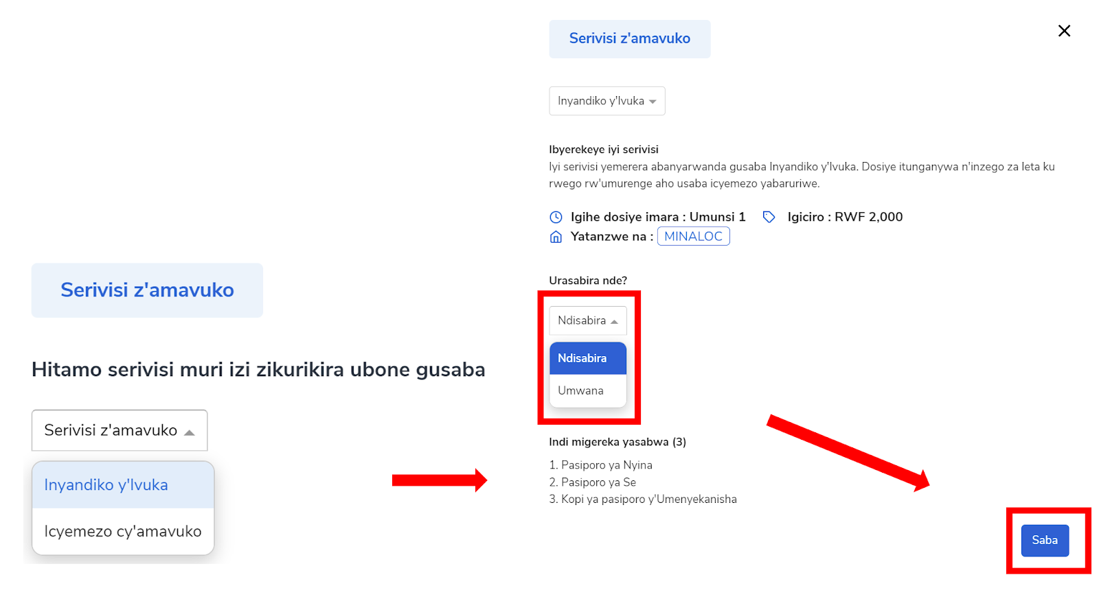 Toranya ubwoko bw'icyangombwa n'inyandiko usaba afite; niba arinomero y'indangamuntu, nomero y'umuturage usaba, cyangwa nomero y'igihugu iranga umuntu (NIN). Amakuru azahita yizana maze agaragare ku ruhande rw'iburyo rwa paji. Kanda ibikurikira kugira ngo ukomeze.