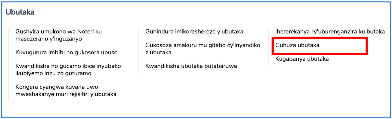 Icyitonderwa: Ibibanza bigomba guhuzwa bigomba kubarurwa ku muntu (abantu) umwe (bamwe), bikagira imbibi zimwe, bikaba bifite ikintu kimwe bukoreshwa na nyir'ubutaka umwe ubufiteho uburenganzira kandi bukaba buherereye mu kagari kamwe.