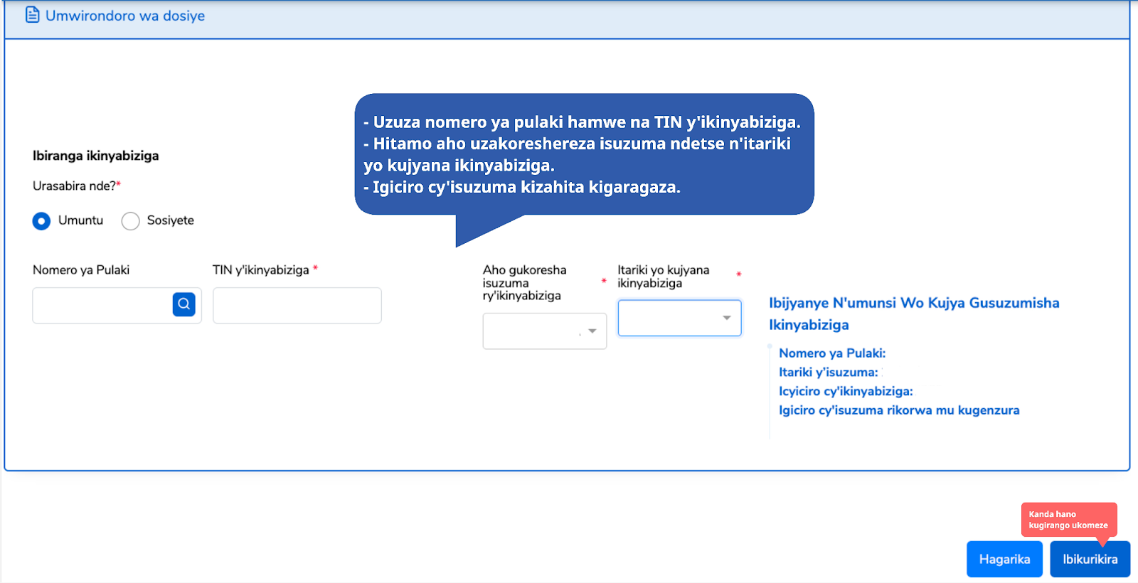 Intambwe ya 4: Hitamo uko usaba serivisi, waba usabira umuntu ku giti cye cyangwa ikigo, hanyuma winjize amakuru y’ikinyabiziga. Kanda “Ibikurikira” kugira ngo ukomeze.